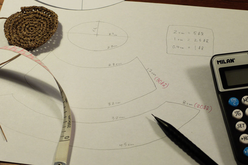 ここから先、トップの編み目でもう一度ゲージを計り、サイドが図面のサイズになるには何段おきに何目増やしていけば良いか計算しました。(詳しくは最後に。)