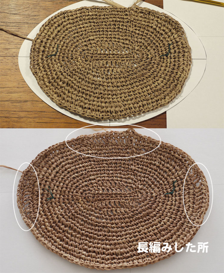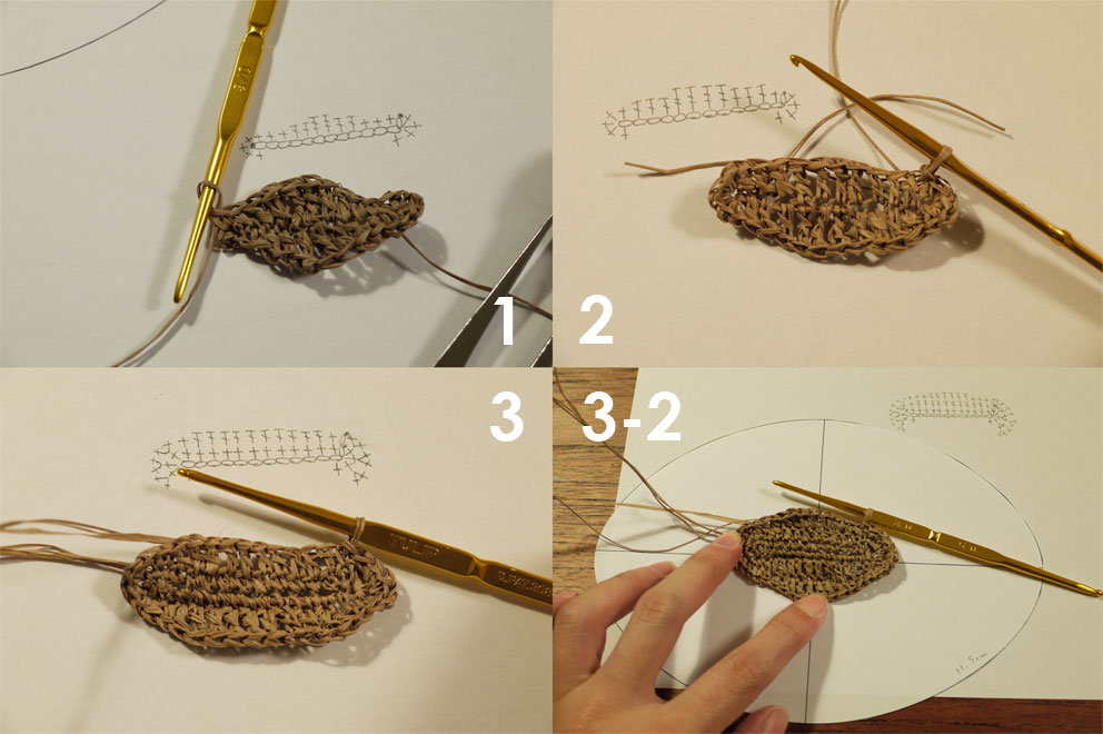 3-2は3段目編んだところ。長編みを入れて、型紙の楕円に近づけました。
