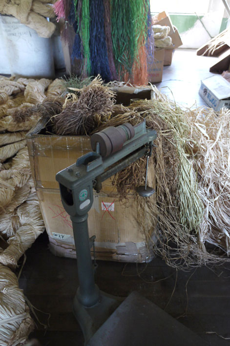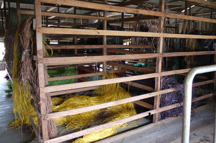 まず目に飛び込んできたのは、染色前のラフィアの山。ラフィアはマダガスカルから輸入しているとのこと。マダガスカル産のものが最も上質なんだそうです。そもそもラフィアというのはラフィア椰子という木の葉の部分で、まだ開かない若く柔らかい葉を使用するそうです。