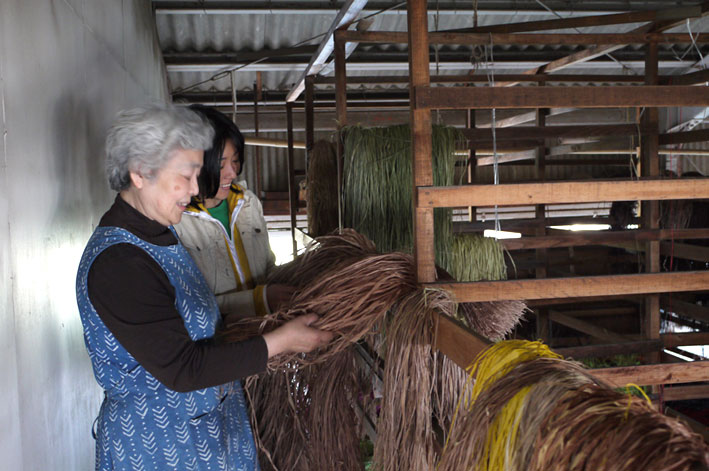 ところでなぜ佐原でラフィアなんですか?と質問すると、もともと先代が和傘の生産をしており、当時では珍しく海外に輸出もしていたそうです。(明治6年のことで、佐原ラフィアは100年の歴史だそうです!)その頃知り合ったアメリカのバイヤーにラフィアという素材を紹介されたことから始まったとのことです。それから先代の奥様(とっても頭の良い方だったそうですよ。)が染め、編み方などを熱心に研究されたそうです。ラフィアの染めは染料がなかなか浸透せず、試行錯誤を繰り返し試験場にも足を運び、現在の品質の基盤を作ったそうです。作った色は100色にのぼるとのこと!商品の生産については、東北地方で雪の季節に手が空く人達を職人さんとして育成したそうです。そうした努力が今も受け継がれているという事は本当にすばらしい事だと思いました。