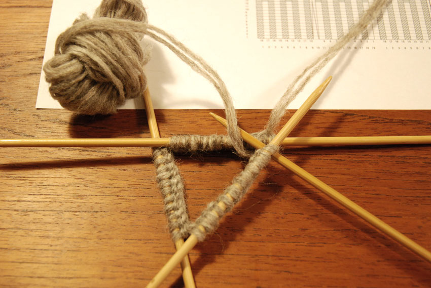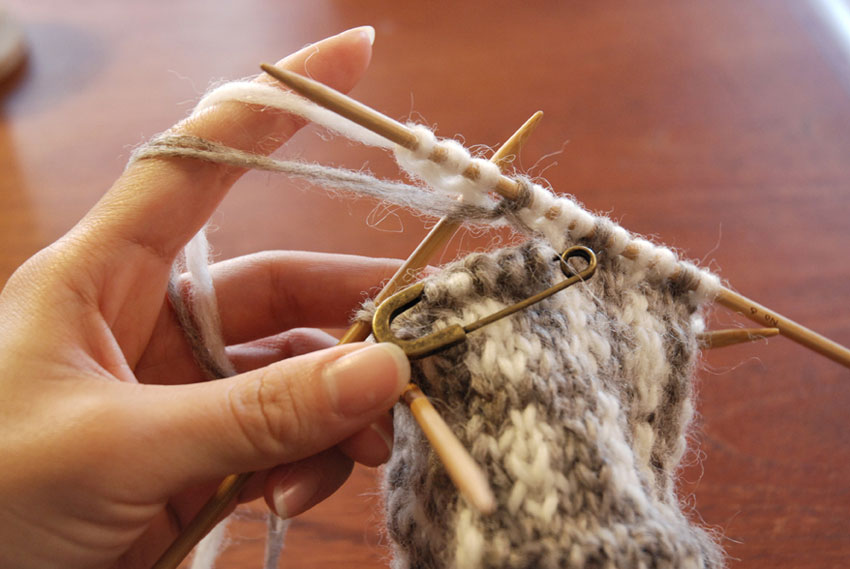 1段目ができたら3分割して棒針を通し、メリヤス編み。