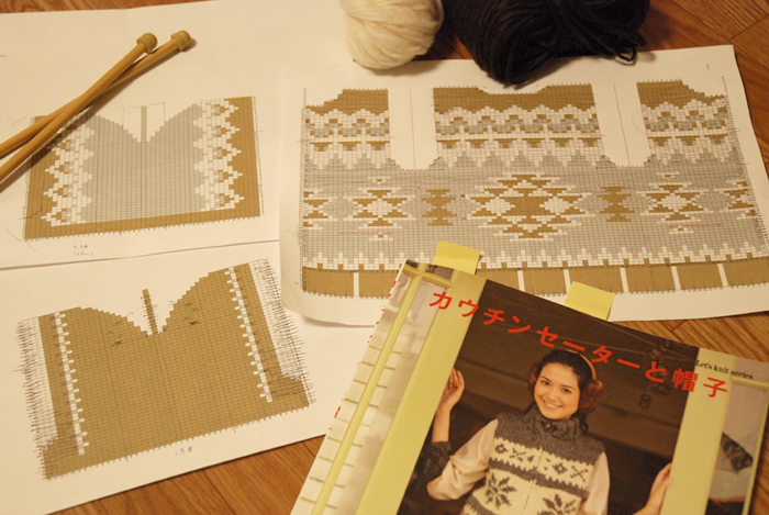 柄は、初めは左上の柄の予定が、胴本体が出来上がったのを見て、うるさくなりそうだったので、下の柄に変更しました。ただ、フードをちょっと作り始めてからまた気が変わって、結局図面の両端の下にちょっと柄を入れるだけにしました。