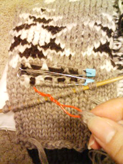(↑なくても出来るが、上身頃を編む時便利だった。ホントは8mm針で編むべき。なかったので代用。)