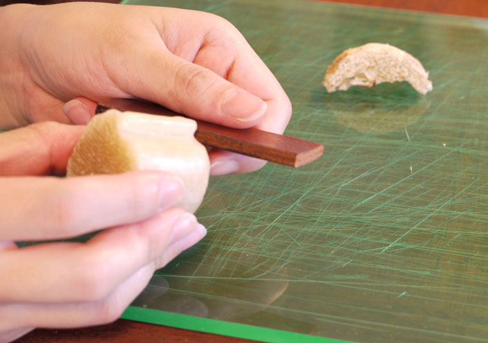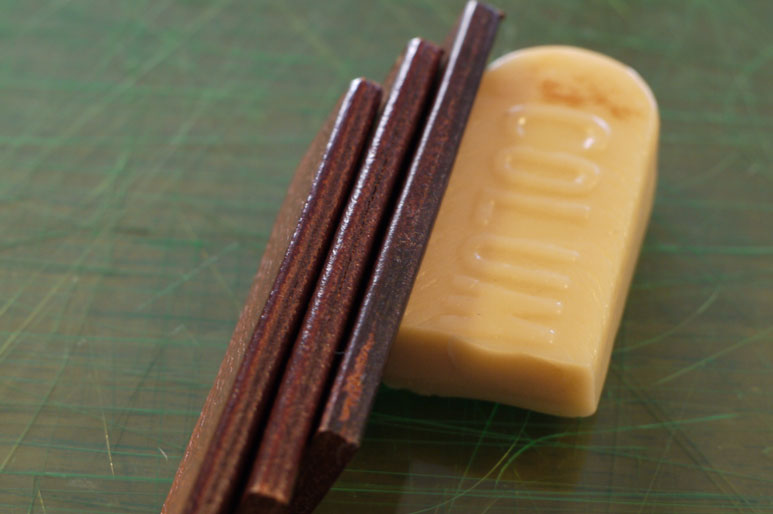 先に蜜蝋をコバに擦り込んでから、アイロンをあてて溶かす。