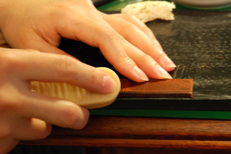 コバ磨きにはいろんな方法があり、職人さんそれぞれのこだわりがあって、使う道具や処理剤もいろいろあります。ほとんどの既製品は、生産効率を上げる為に切り口に顔料を塗っただけ、というのが多いです。