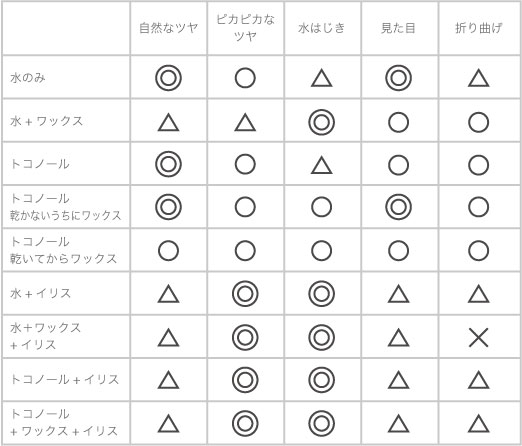 勝因は、一番大事な自然なつやと、ワックスによる耐水性。それから目がしっかり詰まった感じで、見た目も一番良かったです。