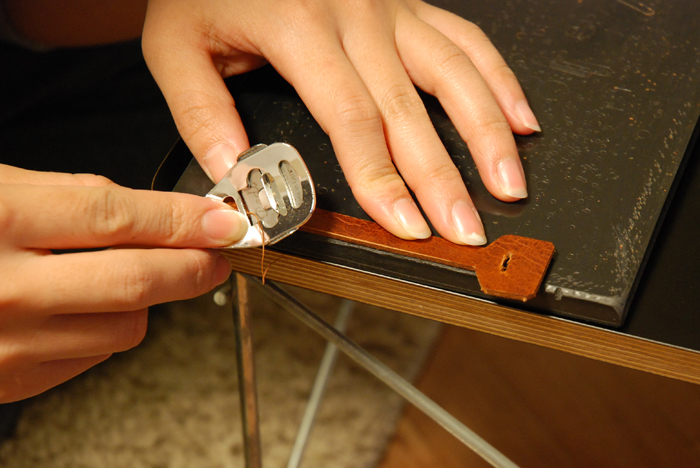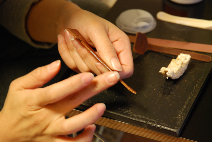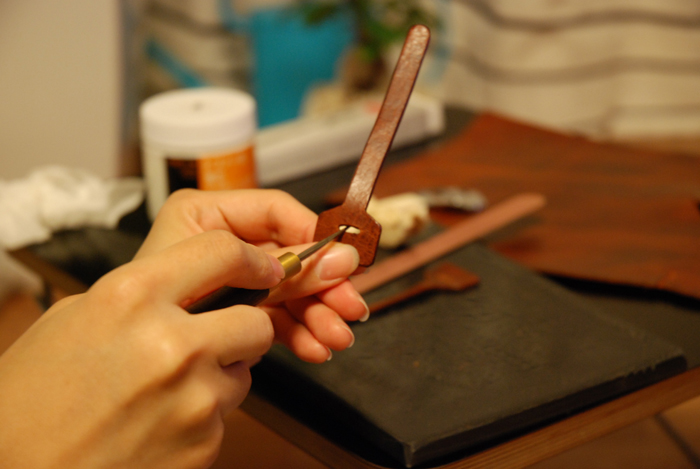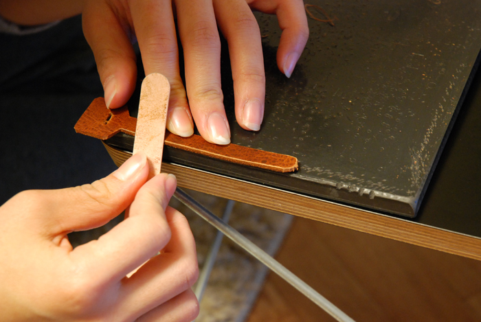 一番目の写真のように、まず裁断した革のコバの角を革漉きで面取りします。(Pedi社のを使用。一般的なものです。)