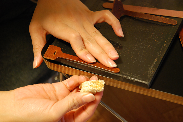 使用した革はイタリアのヌメ革で、オイルが良く入っているためコバを磨くととても美しい艶がでます。