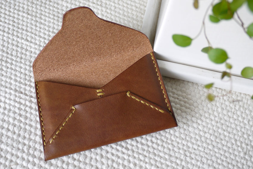 トコノールとヘチマを使ったコバ磨きのやり方です。こればっかりは経験です(笑)。でも一番楽しい行程だと思います。それから今回は植物タンニン鞣し(なめし)の革を使っていますが、革によって磨き上がりは違ってきます。なので苦労もするけど一番こだわりたい所だと思います。