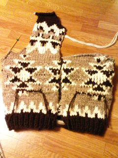色の違う糸を前に出したり、裏に出したりして柄を出していきますが、裏に出る糸が数目飛んで渡らないように、いちいち絡ませながら編みます。