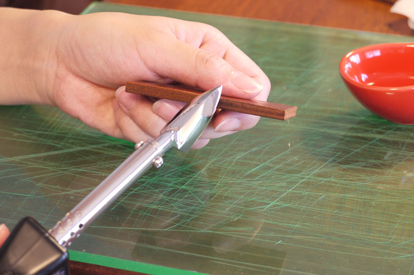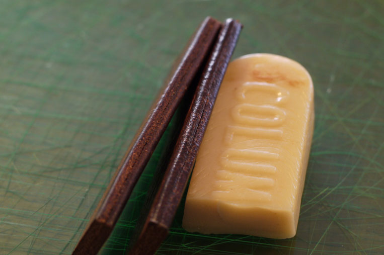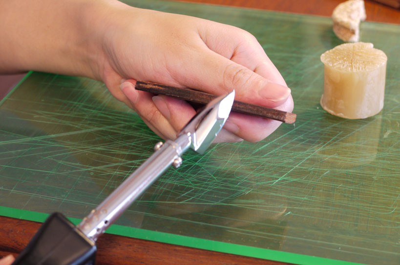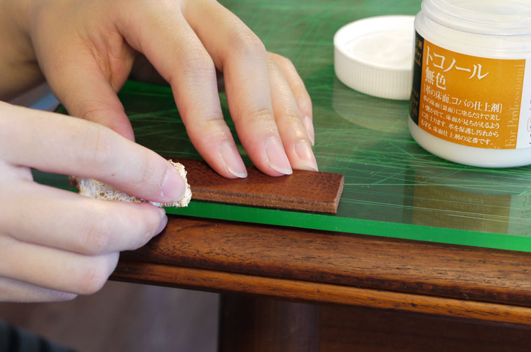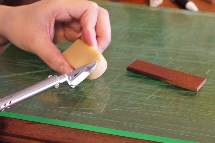 先に蜜蝋をコバに擦り込んでから、アイロンをあてて溶かす。