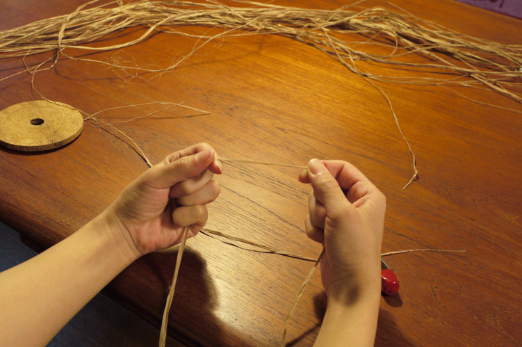 糸作りで気づいたことは、乾燥した葉を何度も擦ってるのだから、例えば笹の葉みたいに手を切ったりしないのかとちょっと心配だったのだけど、手が荒れることは全くないし、むしろ微妙な油分?のおかげで、指先がつやつやしてくる感じがします。しかも、強い。どんなに引っ張っても切れることはほぼないです。ラフィアの繊維は非常に強くて、永い月日が経ってもその強さはほとんど衰えないそうですよ。そこがラフィアの魅力なんでしょうね。